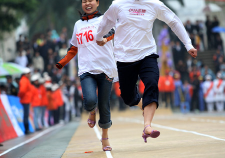 Updated: 2009-03-09 13:02 A couple runs in high heels during a race at a shopping mall in Dongguan, south China's Guangdong province, March 8, 2009. The event attracted more than 400 people to mark International Women's Day. [CFP] |