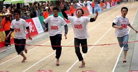 Participants cross the finish line during a race of running in high heels at a shopping mall in Dongguan, south China's Guangdong province, March 8, 2009. The event attracted more than 400 people to mark International Women's Day. [CFP] |