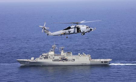 Updated: 2009-03-10 09:57 A warship and a military helicopter attend the AMAN 09 military drill at the Arabia Sea off the southern Pakistani port of Karachi, on March 9, 2009. Warships from participating countries Monday began their second phase of the two-week-long AMAN 09 military drill at the Arabia Sea off the southern Pakistani port of Karachi. [Xinhua] |