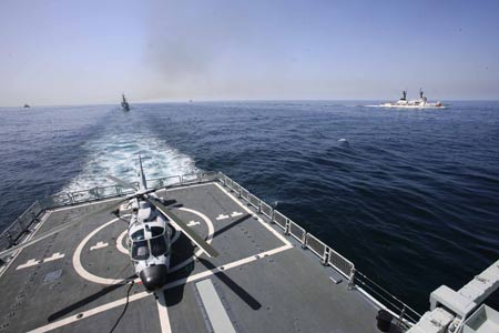 Updated: 2009-03-10 09:57 China's navy "Guangzhou" destroyer is seen at the Arabia Sea off the southern Pakistani port of Karachi, on March 9, 2009. Warships from participating countries Monday began their second phase of the two-week-long AMAN 09 military drill at the Arabia Sea off the southern Pakistani port of Karachi. [Xinhua] |