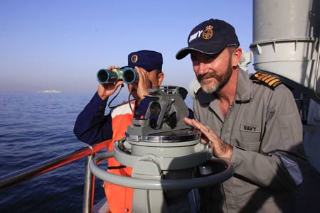 An Australian navy observer (R) watches the AMAN 09 military drill on China's navy " Guangzhou" destroyer at the Arabia Sea off the southern Pakistani port of Karachi, on March 9, 2009. Warships from participating countries Monday began their second phase of the two-week-long AMAN 09 military drill at the Arabia Sea off the southern Pakistani port of Karachi. [Xinhua] |