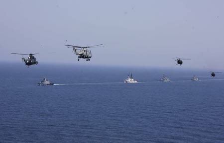 Warships and military helicopters attend the AMAN 09 military drill at the Arabia Sea off the southern Pakistani port of Karachi, on March 9, 2009. Warships from participating countries Monday began their second phase of the two-week-long AMAN 09 military drill at the Arabia Sea off the southern Pakistani port of Karachi. [Xinhua] |