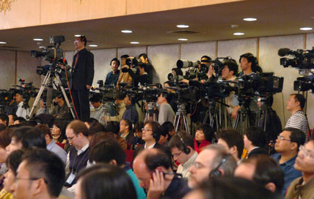 ![]() Cameramen work at a press conference on "Boosting domestic demand, employment and economic growth" on the sidelines of the ongoing NPC annual session, in Beijing, March 10, 2009. [Xinhua]