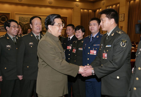 Hu, also chairman of the Central Military Commission, made the remarks at a plenary meeting of PLA deputies to the National People's Congress (NPC), the top legislative body. He stressed the Party's leadership in the armed forces and called for the scientific development of defense and armed forces. The armed forces shall voluntarily serve the overall work of the Party and the country, and contribute to economic development and social stability, he added. He also told local Party committees and governments to support the development of defense and armed forces. |