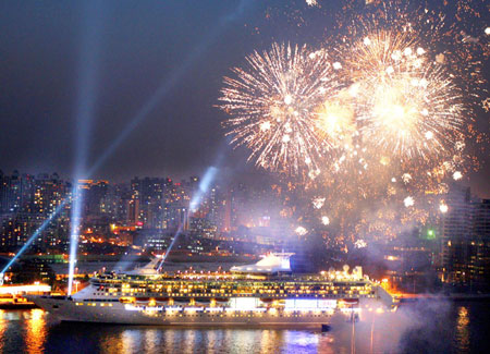 Updated: 2009-03-15 08:53 Passenger liner "Legend of the Seas" carrying 1,600 mainland tourists leaves for Taiwan at a port in Shanghai, East China, March 14, 2009. [Xinhua] |