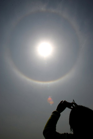 ![]() A citizen takes picture of solar halo in Zhuhai.The scene of solar flare appeared in Shenzhen, Zhuhai and other cities of Guangdong province, south China on Saturday. [Xinhua]