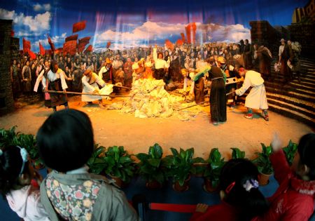 Visitors are seen at an exhibition entitled "Democratic Reform in the Tibet autonomous region" in Beijing, capital of China, March 15, 2009. [Xinhua]