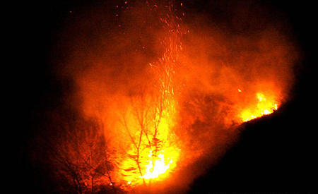 A fire, which broke out on Satuarday, engulfed forest in Lingshou County near the capital Shijiazhuang in north China's Hebei Province, Monday March 16, 2009. The fire is roughly under control by Monday morning. [Xinhua]