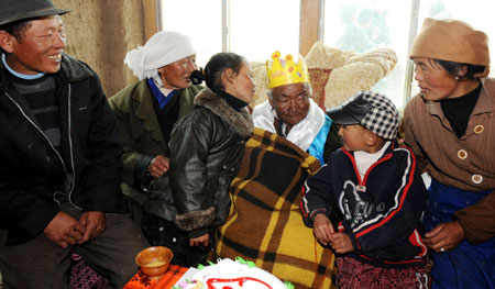 In her best clothing -- a blue vest, green woolen sweater and a brand new Tibetan costume -- Tsering sat quietly under an umbrella in her courtyard to enjoy the sunshine as guests, mainly county and village officials and a few reporters, poured in. Everyone offered a hada, a white, Tibetan-style scarf, and wished her good health. One by one, the old woman quietly counted the beads in her left hand, while the crowd curiously watched her and snapped photos. Tsering was born on March 16, 1891, in a small village in Ngari Prefecture. She moved with her husband to Lhunzhub County, about 40 km northeast of Lhasa, in the 1930s. "Happy birthday to you ..." everybody sang in Mandarin and Tibetan as the birthday cake was shared. Three Tibetan women, all village officials, sang a Tibetan song to congratulate her. Said one: "Of all the people I know, no one is as lucky as you ..." Tsering couldn't see or hear them: she's lost her hearing and eyesight. She sat motionless when her daughter fed her birthday cake, but smiled when her great-granddaughter, 9-year-old Medo Drolma, naughtily daubed cream on the old woman's cheeks and nose. Tsering can't talk much either, anymore, except for the occasional articulation of a daughter or grandchild's name. There is hardly any expression on her tanned face, except when a fit of coughing makes her grimace in pain. "Mom's health is deteriorating every day," said her daughter, Yangjen, 70. "She has high blood pressure, asthma and chronic bronchitis. Her memory is fading and she rarely talks." Until three years ago, Tsering was still able to walk around on her stick or even go shepherding. Today, she spends most time sitting or lying. Wherever she goes, her granddaughter Shaboi carries her on her back. When asked about Tsering's secret of longevity, Yangjen said it was just tea, minced beef and zanba, a Tibetan food made of fried barley flour. "Plus a hot temper, maybe," she said. "My mother was very outspoken and straightforward in her younger days. Sometimes she couldn't control her temper." Yangjen is the second of three children and the only one to survive to old age. She doesn't remember much about her father, who died of illness when she was about 8. "My father used to travel with a horse caravan that carried tea, salt and fabric to different parts of Tibet," said Yangjen. After her father died, the family could only make a living by begging or working as shepherds or domestic servants for a rich family. Yangjen's elder sister and younger brother both died of illness in those years. "My mother is not able to talk any more, but she knows everything by heart," said Yangjen. "We are both happy with today's life, without having to worry about food, clothing or shelter. Just think about it, if we were still begging and homeless, how could my mother have survived to such an age?" Yangjen's family is not rich even by local standards, with only 1,000 yuan (US$147) in per capita farming income a year. The extended family has 13 people, but her three sons live separately. Her daughter Shaboi, 38, is the only breadwinner and caregiver at home. Shaboi remains single. She plants barley, wheat and potatoes on about one hectare of land. |