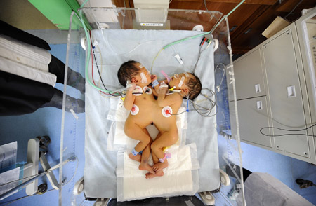 Updated: 2009-03-20 10:00 The conjoined twins are treated at the provincial children's hospital in Changsha, central China's Hunan province, March 19, 2009. The twin girls are conjoined by their bellies, sharing one umbilical cord when they were born three days ago in the Xinhua county of Loudi city, Hunan province, but they are in stable condition. The hospital will give them a thorough examination before a separation surgery. [Xinhua] |