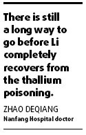 But after 23 days of treatment, medics at Nanfang Hospital in Guangzhou, where she was transferred to from a local hospital that lacked the facilities to help her, this week cleared her to return home with her parents to Suzhou, in Jiangsu province. Meanwhile, police said they have arrested the man who sold Li the potentially lethal poison online. "There is still a long way to go before Li completely recovers from the thallium poisoning. There is no telling what might happen or whether there will be a hangover in the future," said Zhao Deqiang, a doctor at the hospital yesterday. Thallium is a partially soluble soft metal that is highly toxic and is used in rat poisons and insecticides. It has become known as the "poisoners' poison" for its use in several murders. A bluish-grey substance, it can easily be absorbed through the skin, lungs and digestive tract, causing serious damage to the stomach and nervous system, in some cases leading to paralysis and even death. Li graduated from Nanjing University last year but, according to her parents, had become too depressed to start looking for a job.