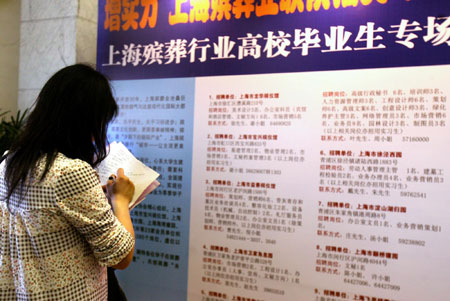 A college graduate stands before an information board at a job fair of funeral companies at Shanghai Human Resource Exchange Center, March 21, 2009. [Xinhua] |