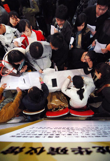 Desperate job-hunting graduates line up for interviews with funeral companies at a job fair at Shanghai Human Resource Exchange Center, March 21, 2009. [Xinhua]