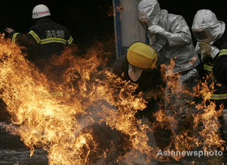 Updated: 2009-03-23 11:27 Firefighters carry tanks of liquid gas out of a burning gas tank warehouse in downtown Luoyang, central China's Henan province, March 21, 2009. Over 70 firefighters fought the blaze for an hour, removing 81 compressed gas tanks out of the burning building. According to firefighters, the blaze was caused by an illicit operation of the gas tanks and a man had serious burn injuries. [Asianewsphoto] |