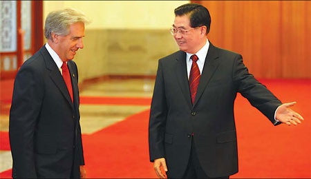 No further details were released to the press. President Hu Jintao and Tabare Vazquez, his Uruguayan counterpart, officiated at the signing ceremony after an hour-long talk. "My visit to China is of deep political significance," Vazquez said at the beginning of his meeting with Hu. "We believe in the power of politics, and believe we can enable our people to enjoy a very good life through political achievements," the Uruguayan leader said. China is Uruguay's third largest trading partner. Uruguayan newspaper El Pais said on March 19, the day Vazquez departed for China, that the visit aims to expand trade with China amid the financial crisis. According to Uruguay's official figures, its exports dropped 20.2 percent year-on-year last month, a decline for a fourth month in a row. It is reported that the Uruguayan unemployment rate among youngsters reached 20 percent at the end of last year. During the meeting, Vazquez stressed the need to establish a new international financial system and hoped the G20 summit in London next month would help developing countries cope with the economic woe. Hu told Vazquez China pays great attention to the G20 summit and will push for "positive results" at the summit. High-ranking officials from the two countries yesterday also signed deals on technology, water resources, sports and collaboration between China's central television station and Uruguay's state TV station. More deals are expected to be inked during Vazquez's six-day visit to the country, which started on Saturday. Today Vazquez will lead his delegation consisting more than 80 entrepreneurs and several ministers to visit China Council for the Promotion of International Trade, and attend a meeting of entrepreneurs from the two sides. There, according to the agenda announced by the Uruguayan government, Uruguayan Economy and Finance Minister Alvaro Garca will introduce "Ronda Uruguay 2009" plan, which invites world's investors to explore oil and gas in Uruguayan seas. Vazquez would meet top legislator Wu Bangguo and Premier Wen Jiabao and then fly to the economic hub of Shanghai today, where he will sign the contract of Uruguay's participation at the 2010 World Expo. Wang Yizhou, at the Chinese Academy of Social Sciences, said earlier this month that some Latin American countries hard hit by the financial crisis are willing to strengthen cooperation with China. |