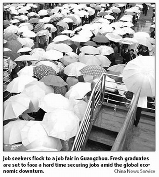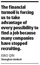 According to SFSC's report, two-thirds of students have sent out more than 30 resumes since last autumn, with one frenzied student even sending out 600 copies to recruiters, Wu said. "The financial turmoil is forcing us to take advantage of every possibility to find a job because many companies have stopped recruiting," said Xiao Qin, 22, a student from Shanghai International Studies University. Jia Dong, a computer major graduate, said, "I have hardly missed a chance to hand out my resume since last year - job fairs, campus recruitment sessions or even by e-mail. With more than 120 copies of my resume out there I think I deserve better."