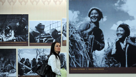 A Latvian diplomat visits the 50th Anniversary of Democratic Reforms in Tibet exhibition in Beijing, China, on March 25, 2009. Over 150 foreign diplomats and representatives of international organizations visited the exhibition on Wednesday. [Xinhua] |