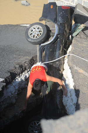 A rescuer searches for possible victims after the Bofeng reservoir collapsed in Xinglong Town of Wanning City, South China's Hainan province, March 28, 2009. Three people in two cars were injured and hospitalized after the road collapse. [Xinhua] |