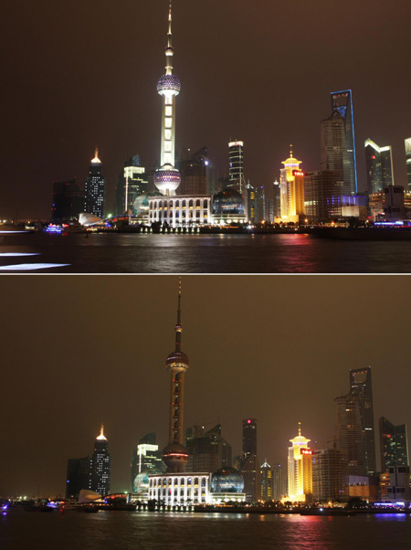 A combination picture shows a view of the Bund on the banks of the Huangpu River in Shanghai before (above) and during Earth Hour March 28, 2009. [Xinhua]