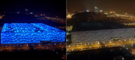 A combination picture shows China's National Aquatics Center "Water Cube" in Beijng before (L) and after the lights were turned off for Earth Hour March 28, 2009. About 20 Chinese cities joined a worldwide campaign to persuade the public to switch off unnecessary lights for one hour Saturday night to support energy-saving efforts and show concerns about global warming. [Xinhua]