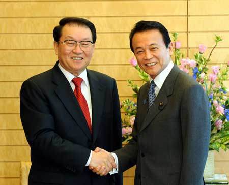 Li Changchun (L), a member of the Standing Committee of the Political Bureau of the Communist Party of China (CPC) Central Committee, meets with Japanese Prime Minister Taro Aso in Tokyo, on March 30, 2009. Li Changchun arrived in Tokyo to kick off his official goodwill visit Sunday. [Xinhua]