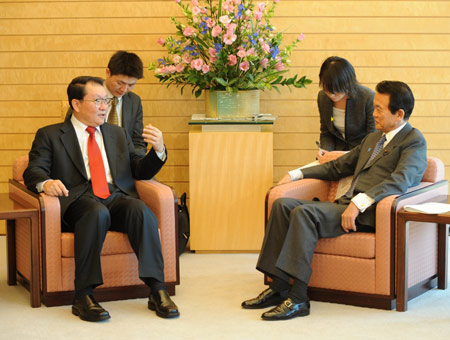 Li Changchun (L), a member of the Standing Committee of the Political Bureau of the Communist Party of China (CPC) Central Committee, meets with Japanese Prime Minister and chief of the ruling Liberal Democratic Party (LDP) Taro Aso in Tokyo, Japan, on March 30, 2009. [Xinhua]