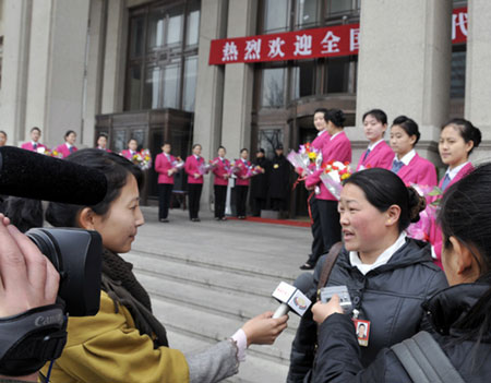 A deputy to the Second Session of the 11th National People's Congress (NPC) from Tibet is interviewed by reporters in Beijing, March 2, 2009. The Second Session of the 11th NPC is scheduled to open on March 5. [Xinhua]