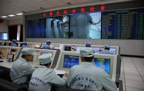 ![]() Workers check the Long March-2FT1 carrier rocket in Jiuquan, Northwest China's Gansu province, Sept 21, 2011. [Photo/Xinhua]