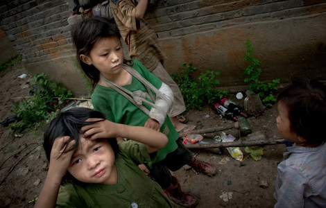 10-year-old Sun Caiyu (center) and her siblings pose for a picture in Woyang county, East China's Anhui province, July 27, 2011. Caiyun broke her arm while playing. The treatment cost several hundred yuan, which could have supported the family's meals for about a month.