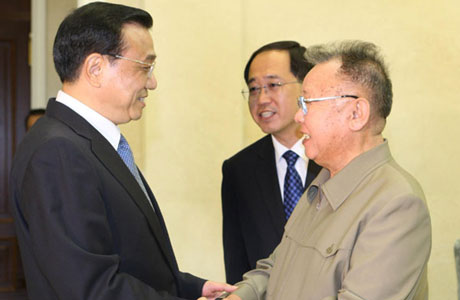 Chinese Vice-Premier Li Keqiang shakes hands with DPRK leader Kim Jong-il during their meeting in Pyongyang October 24