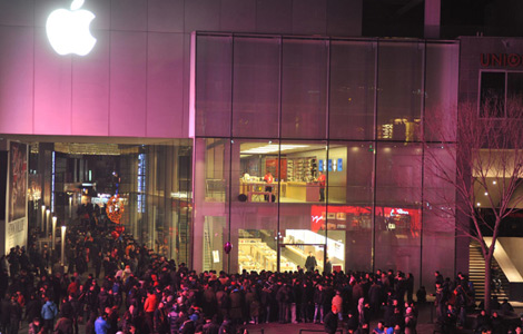 Customers wait in line to buy the new iPhone 4S at Apple's retail store in downtown Shanghai, Jan 13, 2012, moments before the official release of iPhone 4S on the Chinese mainland. [Photo/Agencies] |