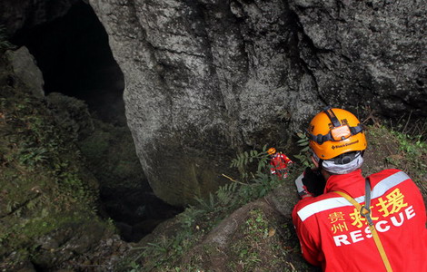 Rescuers rappel down a 215 meter deep cave and recover the body of a backpacker who fell on Monday at Zhuomu village, Shaotong town of Southwest China's Yunnan province, March 22, 2012. [Photo/CFP] |