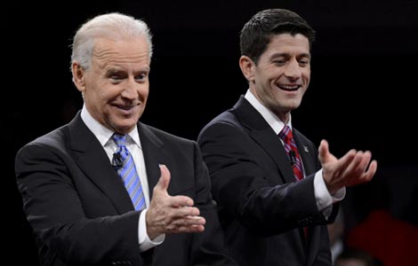 Jiang Xiao (right) performs cross talk with his partner at Renmin University of China in Beijing on April 23. PHOTO BY LIU ZHE / CHINA DAILY |