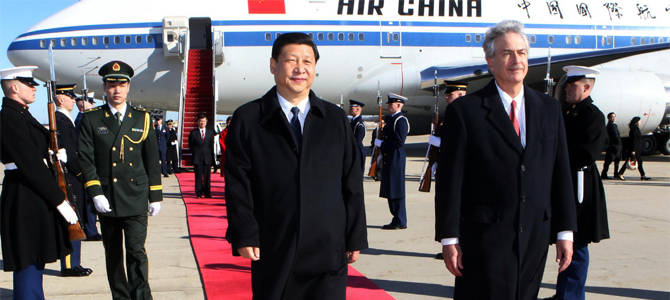 Chinese Vice-President Xi Jinping is welcomed by US Deputy Secretary of State William Burns in Washington on Monday. His visit is expected to boost the relations between the two largest economies in the world. [Lan Hongguang/Xinhua]