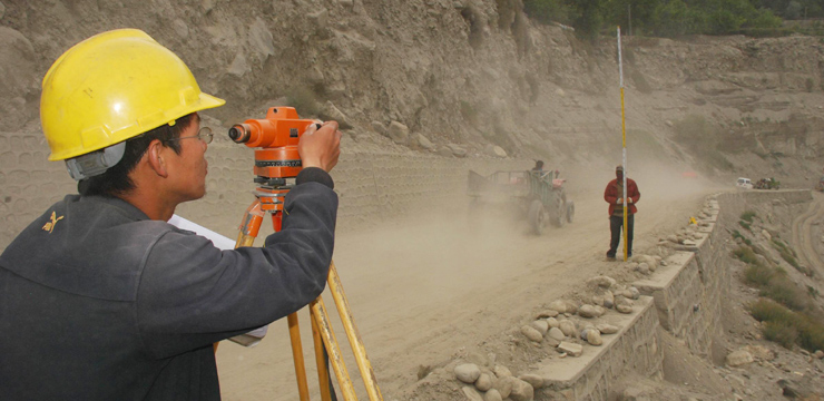 Workers survey the road on the Karakoram Highway construction site in northern Pakistan.