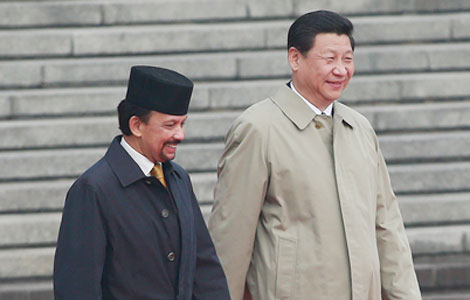 Chinese President Xi Jinping met Brunei's Sultan Hassanal Bolkiah here on Friday to confer on bilateral ties and cooperation in many fields.