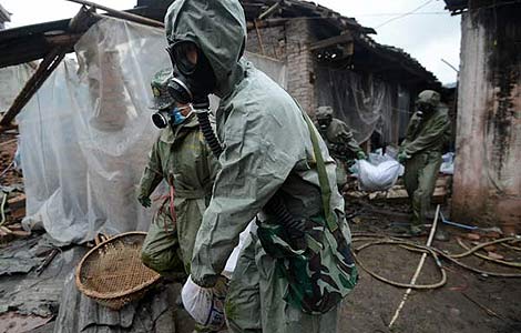Rescue workers in protective clothing deal with decomposed ducks that died in the April 20 quake in Lushan county, Sichuan province, April 24, 2013.