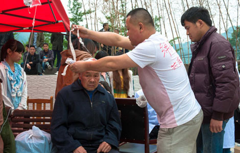 Gao Yunzhen helps her daughter wash her hair in Gucheng village of Lushan county in Southwest China's Sichuan province, April 24.