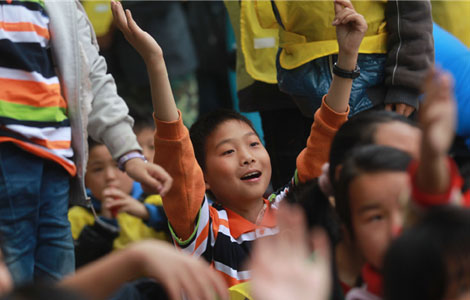 Volunteers help children in quake-hit Lushan county, Southwest China's Sichuan province, by playing games and making drawings, April 23, 2013.