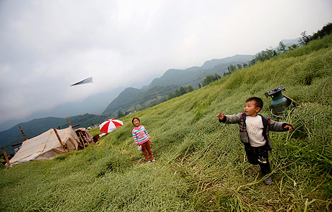Children play at a makeshift camp for people affected by the quake in Baoxing township, Sichuan province, April 23, 2013. [Photo by Wang Jing/Asianewsphoto]