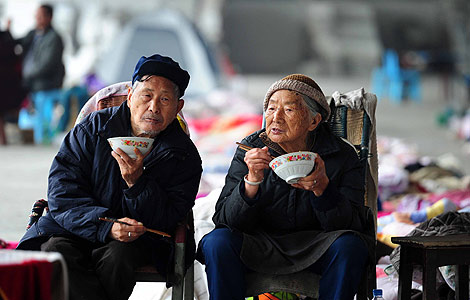 Huang Kaiying (L), 90, and his wife Jiang Zhongyun have lunch at a makeshift camp for people affected by April 20 earthquake in Lingguan township, Sichuan province, April 23, 2013. [Photo by Guo Liliang/Asianewsphoto]
