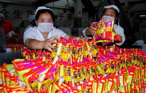 Workers at an instant noodles factory in Shengli town, Neijiang city, Sichuan province, April 14. A total of 100,000 bags of instant noodles have been made in the past two days by workers who worked around the clock and will be donated to quake victims in the province.