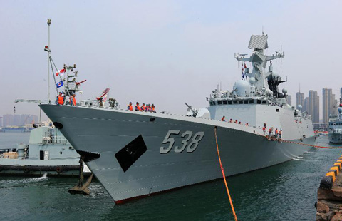 Naval ships from seven countries, including Indonesia, Brunei, Singapore, Malaysia, Pakistan, India and Bangladesh, arrive at east China's Qingdao on April 20, 2014 for the upcoming multi-national marine exercise to mark the 65th anniversary of the founding of the Chinese People's Liberation Army (PLA) Navy.