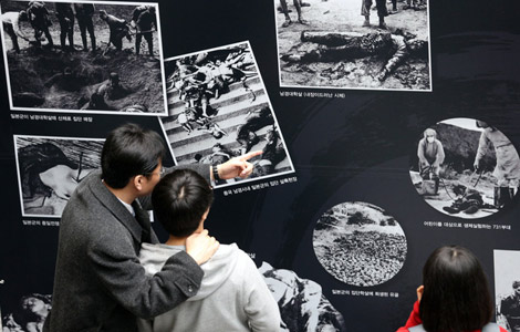 A woman takes pictures of an exhibit of photos documenting Japan's wartime aggression in Seoul, Feb 27, 2014.