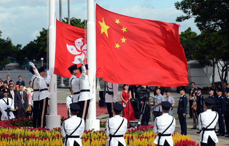 A flag-raising ceremony is held at Golden Bauhinia Square in Hong Kong to celebrate the 15th anniversary of Hong Kong's return to China.