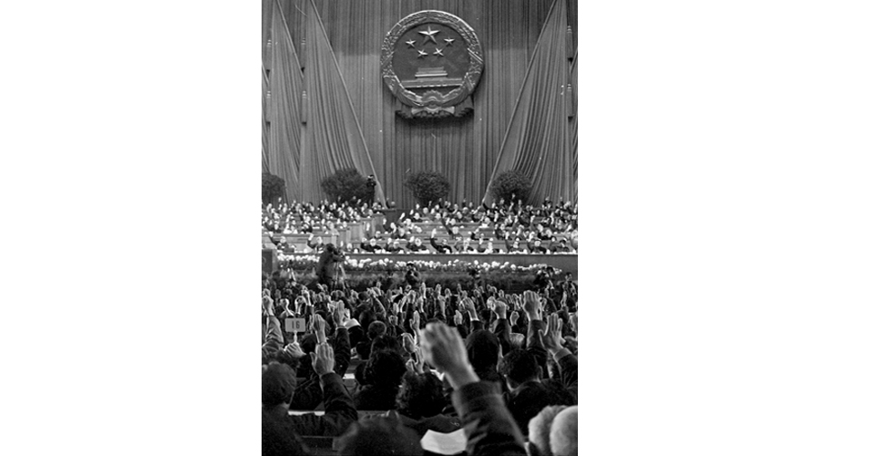 More than 3,000 deputies of the Fifth National People's Congress approve two resolutions by a show of hands on Dec 4, 1982. Before that, they adopted the country's new Constitution by secret ballot. [Photo by Guo Jianshe/China Daily]