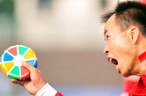 Athlete Jiang Yaofei from Guangdong province falls to the ground in the "firework-snatching" game at the Ninth National Ethnic Games in Guiyang, the capital of Southwest China's Guizhou province, Sept 13, 2011. On the day, Guangdong beat Ningxia by 6 to 5. Firework-snatching, known in China as Qianghuapao, is a traditional sport similar to American football. Two teams of players compete to grab a rubber disc instead of the original firework during the current games. [Photo/Xinhua]