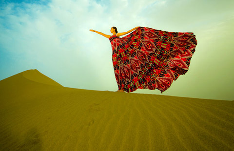 Models present Atlas silk in the Taklimakan Desert in Xinjiang Uygur autonomous region, Aug 25, 2015.