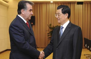 President Hu Jintao met his counterparts from Tajikistan and Kyrgyzstan on Tuesday, and stressed that China will work hard to further enhance relations with the two Central Asian countries.