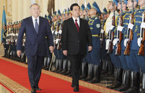 Visiting Chinese President Hu Jintao met with his Kazakh counterpart, Nursultan Nazarbayev, Monday to discuss ways to elevate China-Kazakhstan strategic partnership to a higher level.
